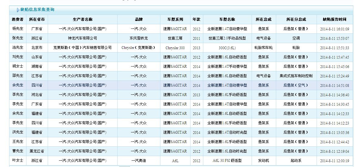 中国经济网记者随即登陆国家缺陷汽车产品召回综合管理信息平台,发现关于2012款、2013款、2014款速腾后悬架缺陷投诉众多,且投诉车主遍布全国各地。