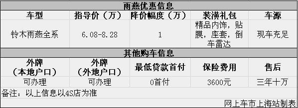 日前网上车市上海站从上海弘品4s店了解到,目前该店铃木雨燕优惠出售,详情请见下表: