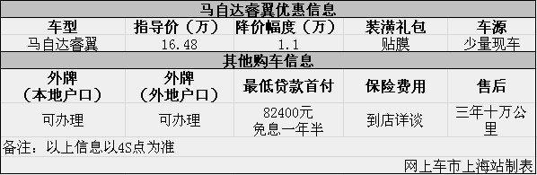 日前网上车市上海站从上海景和4s店了解到,目前该店马自达睿翼优惠出售,详情请见下表: