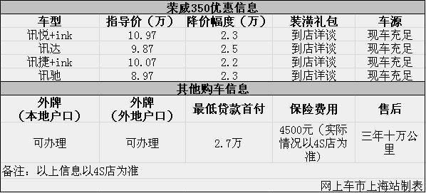 日前网上车市上海站从上海永达4s店了解到,目前该店荣威350优惠出售,详情请见下表:
