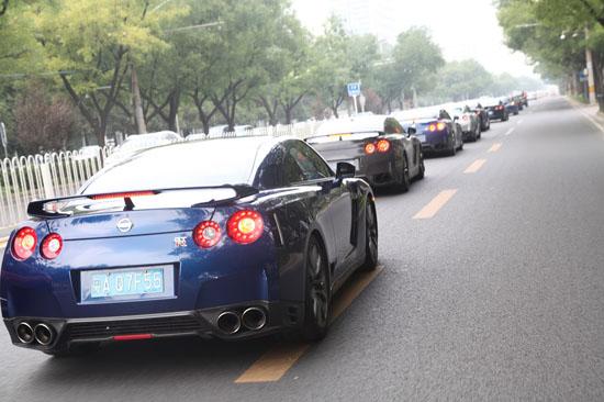 GT-R超跑在北京列队行驶。