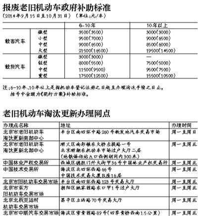 北京市环保局昨日表示,将临时提高老旧机动车报废补助标准。9月15日至10月31日期间报废老旧机动车的车主,在享受现行方案所规定车均6000元补助基础上,车均再增加3000元的补助额度,最高可增加5000元。据此,车龄6—10年的小客车报废补助由7000元/车提高至9500元/车,大客车由16500元/车提高至21500元/车。