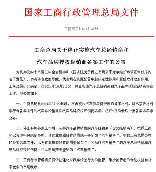8月1日,国家工商总局发布了《关于停止实施汽车总经销商和汽车品牌授权经销商备案工作的公告》,直指当下国家有关部门正在积极进行的汽车行业垄断调查。根据公告的规定,在停止实施备案工作后,从事汽车品牌销售的汽车经销商(含总经销商),按照工商登记管理相关规定办理,其营业执照经营范围统一登记为“汽车销售”。同时,根据工商总局公布的备案名单文件,已将营业执照经营范围登记为“XX品牌汽车销售”的汽车总经销商和汽车品牌授权经销商,可以申请变更登记为“汽车销售”。