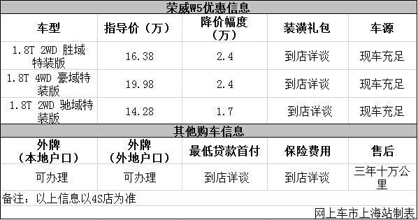 日前网上车市上海站从上海瑞孚4s店了解到,目前该店荣威W5优惠出售,详细请见下表:
