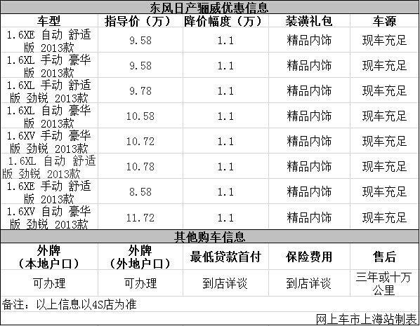 日前网上车市上海站从上海东昌4s店了解到,目前该店骊威优惠出售,详细请见下表: