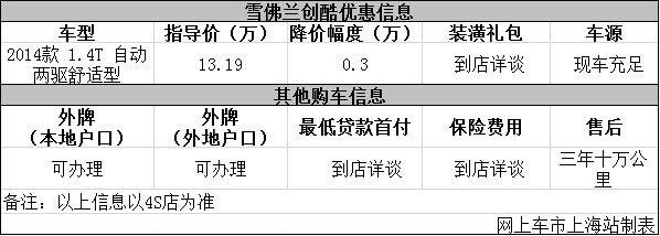 日前网上车市上海站从上海众国同普4s店了解到,目前该店雪佛兰创酷优惠出售,详细请见下表: