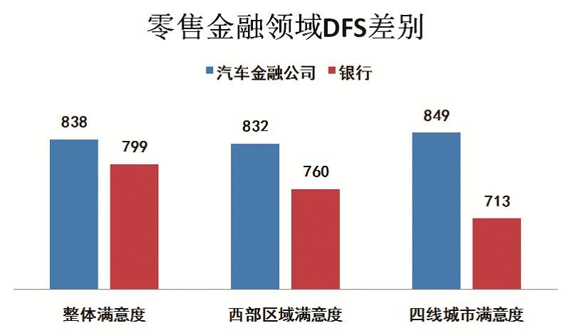 研究结果显示,在零售金融领域,汽车金融公司的满意度比银行高39分(838分对比799分,总分1000分制)。J.D.Power亚太公司中国区汽车金融研究高级经理杨绪表示,汽车金融公司满意度高于银行的原因在于银行业务范围广,面向的客户群广,但是汽车金融公司的客户针对性更强。数据显示,满意度差距主要体现在西部区域(832对比760分)和四线城市(849分对比713分)。但是银行在北部区域(830分)和一线城市(810分)的满意度更高。