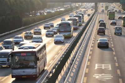 18日17时30分许,四惠,与旁边的普通机动车道相比,公交专用道行驶顺畅。