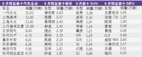 轿车拖了后腿。8月份,本土轿车销量下跌两成,由去年同期的22.45万辆降至17.94万辆。尽管本土SUV和MPV保持快速增长,但仍难以填满轿车挖下的“坑”。
