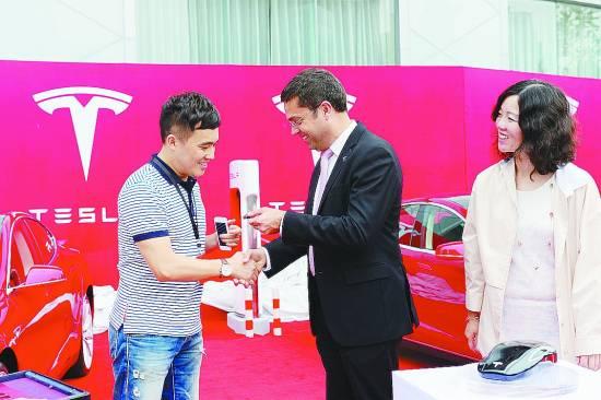 在特斯拉成都交车仪式上,特斯拉全球高级副总裁纪龙向成都车主递交车钥匙。