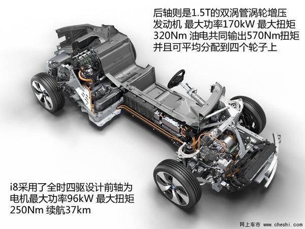 宝马i8既具有大马力跑车的行驶性能又兼具小型车的耗油量。车体结构具有极低的车身重心和接近 50:50的轴载分配比例,为敏捷行驶性能创造了前提条件。插电式混合动力系统既能使车辆在纯电动模式下行驶37km,最高车速达到120 km/h,从静止加速到100km/h只需4.4秒,平均油耗为2.1 L/100km。