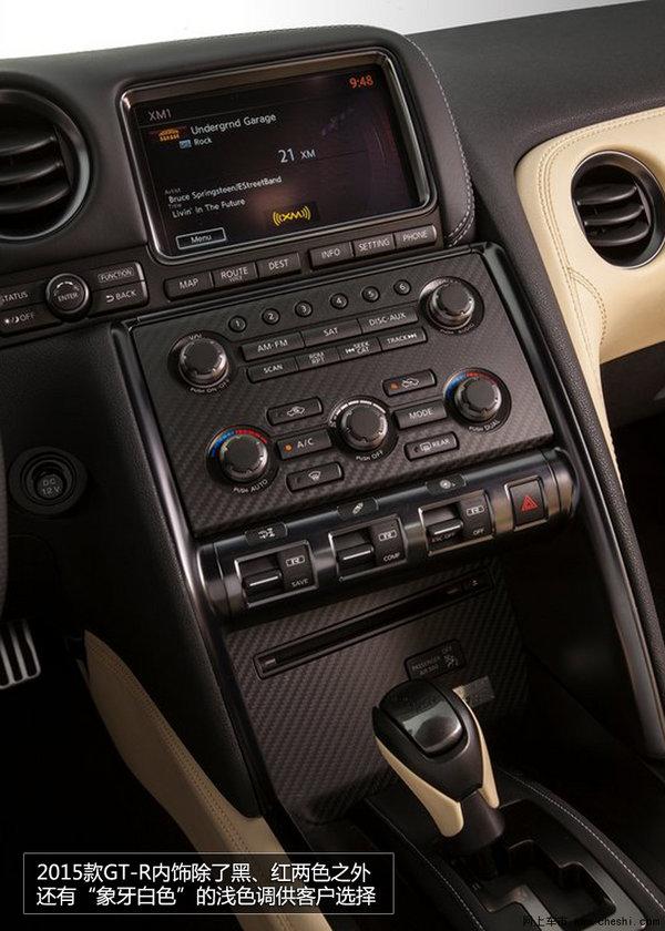 内饰部分几乎没有改变,能看得见的地方就是仪表盘采用了碳纤维材质做陪衬,视觉效果上更加突出了运动色彩。2015款GT-R的内饰新增了一款象牙白颜色供选择,突出了豪华型也更容易与居家联系起来。