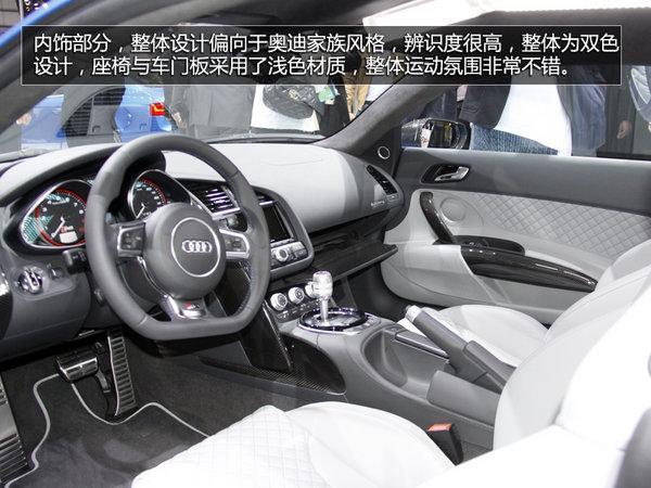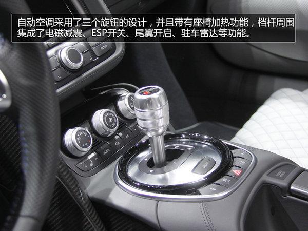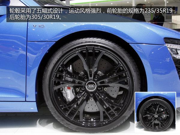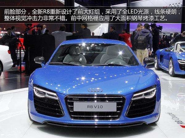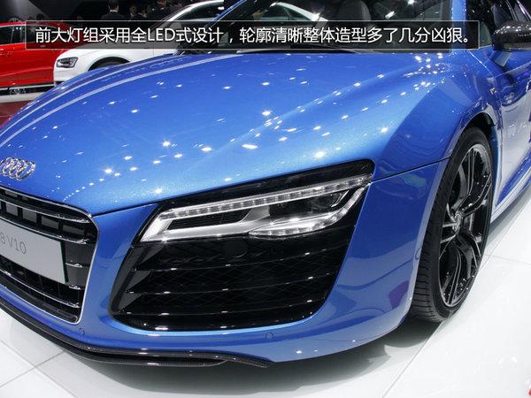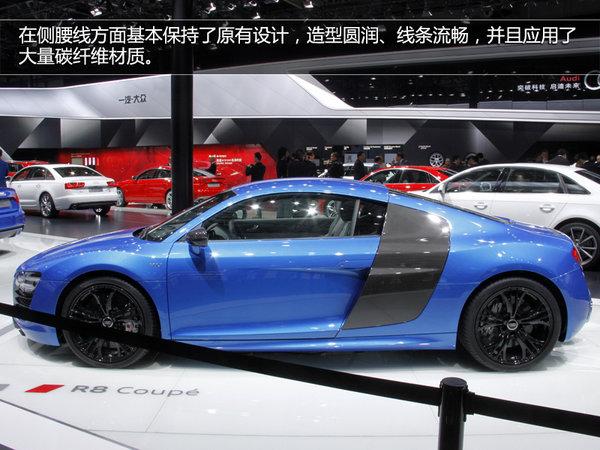 前脸部分,全新R8重新设计了前大灯组,采用了全LED光源,线条硬朗,整体视觉冲击力非常不错。前中网格栅应用了大面积钢琴烤漆工艺。在侧腰线方面基本保持了原有设计,造型圆润、线条流畅,并且应用了大量碳纤维材质。