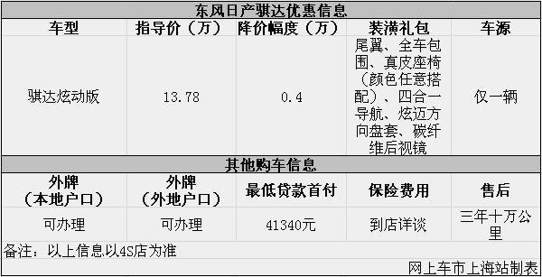 日前网上车市上海站从上海炜业隆佳4S店了解到,目前该店骐达优惠出售,详细请见下表: