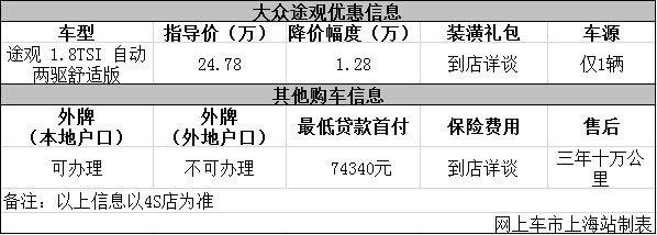上海:大众途观优惠1.28万 店内现车仅1辆