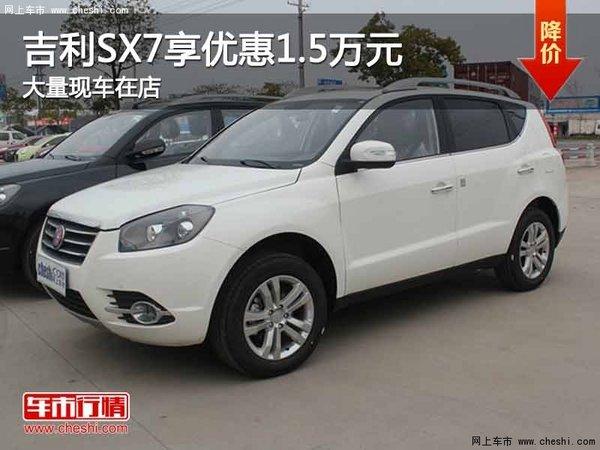 近日,编辑从重庆地区吉利经销商处获悉,2014年09月24日-2014年09月25日,吉利SX7有大量现车在售,购车优惠1.5万元,感兴趣的朋友不妨进一步关注一下。具体优惠信息如下: