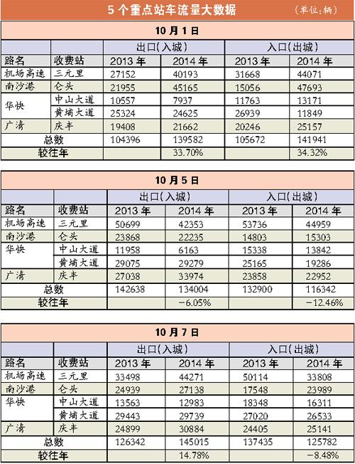 市交通信息指挥中心的数据显示,今年国庆黄金周前夕至假期结束(9月30日~10月7日),市区高、快速路五个主要出入口的车流量分布,呈现较去年上涨的趋势。这五个主要出入口分别是机场高速三元里收费站、南沙港快速仑头收费站、华快中山大道收费站和黄埔大道收费站、广清高速的庆丰收费站。