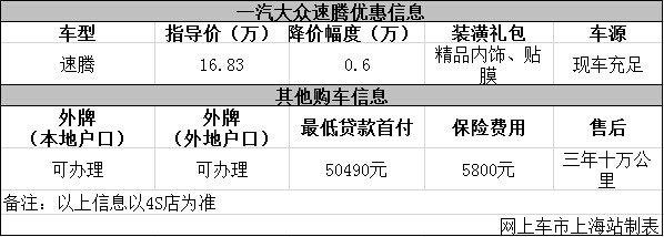 日前网上车市上海站从上海华星众捷4s店了解到,目前该店大众速腾优惠出售,详细请见下表: