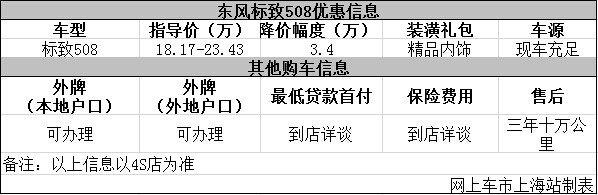 日前网上车市上海站从上海宝狮4s店了解到,目前该店标致508优惠出售,详细请见下表: