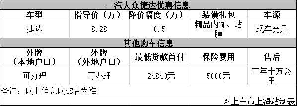 日前网上车市上海站从上海华星众捷4s店了解到,目前该店大众捷达优惠出售,详细请见下表:
