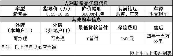 日前网上车市上海站从上海晋熙4s店了解到,目前该店吉利新帝豪优惠出售,详细请见下表: