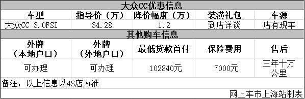日前网上车市上海站从上海华星众捷4s店了解到,目前该店大众CC优惠出售,详细请见下表: