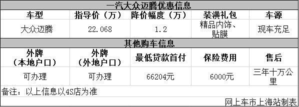 上海:大众迈腾优惠1.2万元 店内现车充足