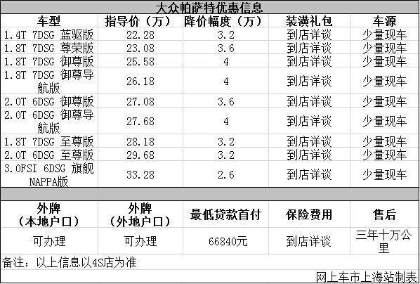 日前网上车市上海站从上海徐汇大众4s店了解到,目前该店大众帕萨特优惠出售,详细请见下表: