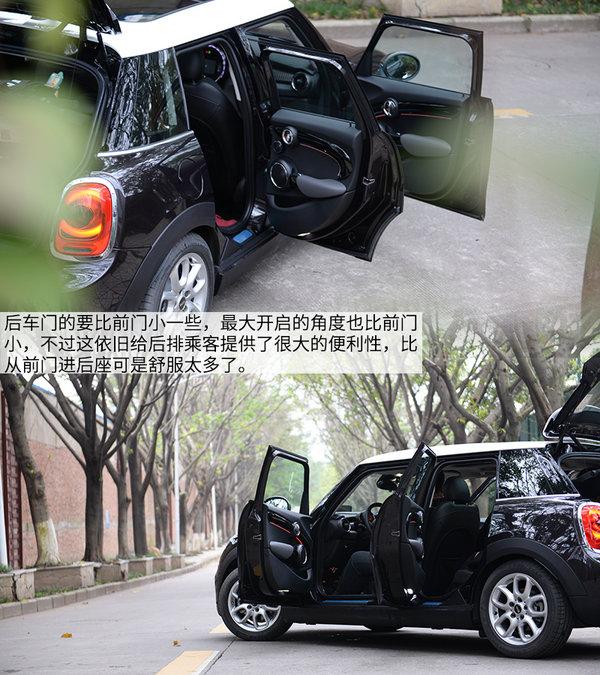 增加的后门是和三门版车型最大的区别,采用五门设计的MINI从侧面 看上去似乎并没有太多的违和之处,依旧是MINI特有的四轮四角,但轴距相比三门增加了72mm,但车身比例看上去和三门车型差不多。