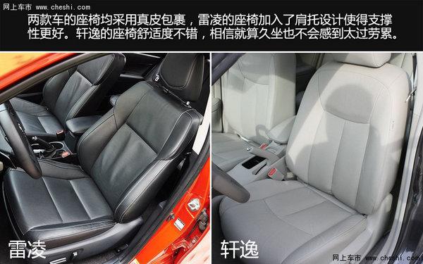 两款车的座椅均采用真皮包裹,雷凌的座椅加入了肩托设计使得支撑性更好。轩逸的座椅舒适度不错,相信就算久坐也不会感到太过劳累。身高178cm的体验者坐进雷凌的前排,将座椅调至到合适位置,头部空间为一拳四指指,腿部空间不感到局促。身高178cm的体验者坐进轩逸的前排,将座椅调至到合适位置,头部空间为一拳三指,腿部空间合适。