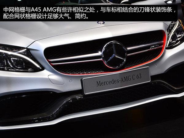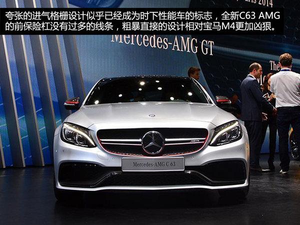 全新C63 AMG车型外观方面的变化可以说在意料之中,相对比普通版本增加了运动套件设计。夸张的进气格栅设计似乎已经成为时下性能车的标志,全新C63 AMG的前保险杠没有过多的线条,粗暴直接的设计相对宝马M4更加凶狠。