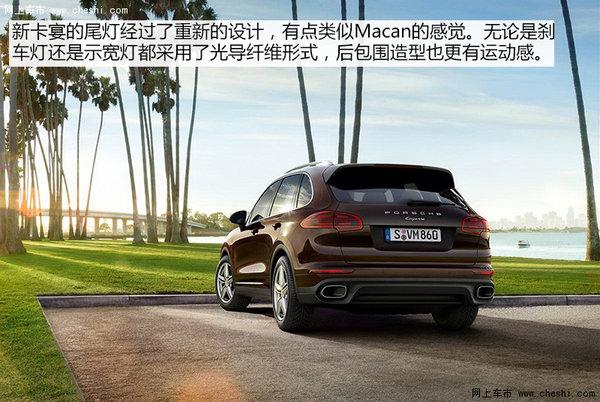 2015款保时捷卡宴的前脸、尾部造型采用小变化设计。前脸进气格栅拥有导流翼片,可更好的引导空气进入冷却系统并使得整车显得攻击性十足。全系标配了双氙气头灯,而2015款保时捷卡宴Turbo车型则使用了LED头灯,并拥有保时捷车灯动态管理系统。