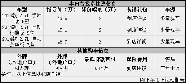 日前网上车市上海站从上海宝和丰田4S店了解到,目前该店普拉多优惠出售,详细请见下表: