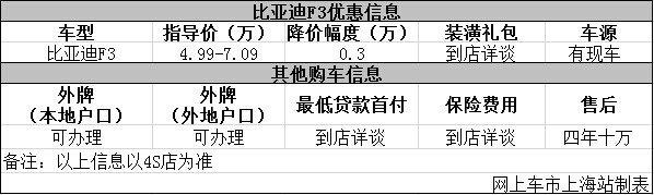 日前网上车市上海站从上海润迪4s店了解到,目前该店比亚迪F3优惠出售,详细请见下表: