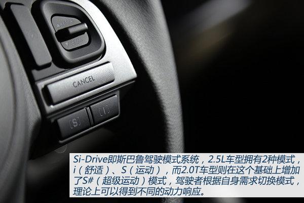 Si-Drive即斯巴鲁驾驶模式系统,2.5L车型拥有2种模式,i(舒适)、S(运动),而2.0T车型则在这个基础上增加了S#(超级运动)模式,驾驶者根据自身需求切换模式,理论上可以得到不同的动力响应。