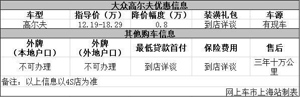 日前网上车市上海站从上海永达豪捷4s店了解到,目前该店一汽大众高尔夫优惠出售,详细请见下表:
