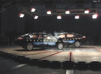 近日,在天津中国汽车技术研究中心新落成的碰撞试验室,广汽本田公开举行了国内首次车对车15°角小重叠率高速碰撞试验,在全球9个NCAP机构代表、国内汽车安全专家以及全国两百家媒体代表的见证下,两辆第九代雅阁分别以56km/h的速度,呈15°斜角以25%重叠率进行碰撞。