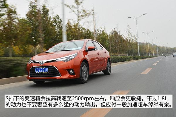 1.8L排量的发动机放在这样一台紧凑级轿车上可以说是动力够用但又照顾到了燃油经济性,在一般城市道路驾驶,仪表盘上会经常出现ECO节油模式的标识,这就在告诉你,这时候是最省油的,这对一些有注重油耗强迫症的人来说算是起到一个很好的提示作用。而S挡位下,发动机的转速会迅速的攀升,而变速器也会模拟出一种强制降挡的感觉,很真实,对于动力的提升效果非常明显。只是高转速带来的发动机噪音也会随之有些增大,所以,除非必须要深踩油门,我建议还是比较温顺的来驾驶这台雷凌比较合适。