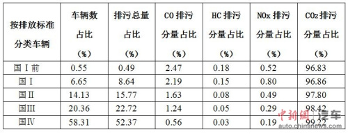 报告中按国家标准分类统计污染量,发现国Ⅰ前的车只占0.55%,污染总量只占0.49%,国Ⅳ的车占了58.31%,污染总量占了52.37。见下表