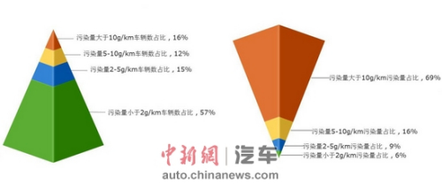 报告中指出:排污量小于2克/公里的车辆总数占57.20%,排污总量只占6.43%;排污量大于2克/公里小于5克/公里的车辆数占14.54%,排污总量占8.68%;排污量大于5克/公里小于10克/公里的车辆占12.33%,排污总量占15.93%;排污量大于10克/公里的车辆占15.93%,排污量总量占68.95%。如果政策对车辆进行排污量分级管理,集中精力抓超标车限行和淘汰高污染车,就能快速削减机动车污染的70%以上。见下图