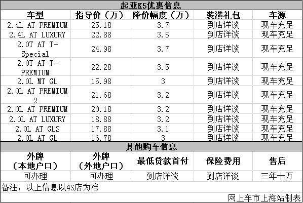 日前网上车市上海站从上海中知起亚4s店了解到,目前该店起亚K5优惠出售,详细请见下表: