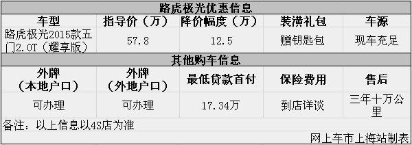 日前网上车市上海站从上海永达路捷汽车销售服务有限公司了解到,目前该店路虎极光优惠出售,具体信息见下表: