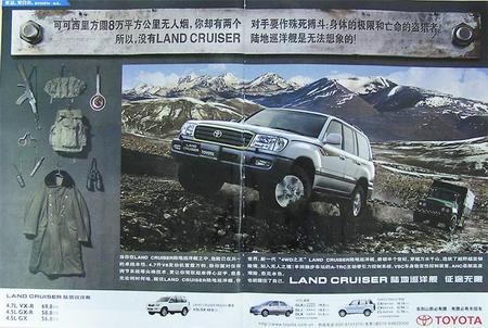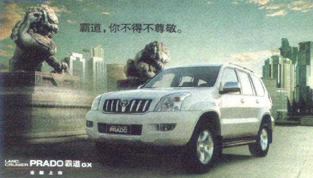 2003年11月,一汽丰田三款SUV——陆地巡洋舰、霸道和达路-特锐上市。不久,两则丰田汽车的广告却将丰田公司、广告制作公司和刊登广告的杂志推到了风口浪尖,在互联网的论坛上,喊打之声一片。