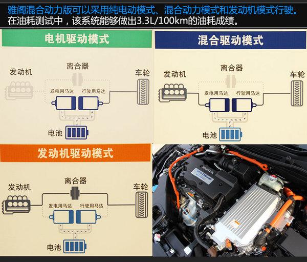 雅阁混合动力版可以采用纯电动模式、混合动力模式和发动机模式行驶。在低负荷下,断开混合动力系统与汽油发动机之间的离合器,单独由用锂电池内储存的电能驱动的两颗电动机驱动车轮;在一般驾驶情况下,离合器依旧保持断开状态,发动机低速运转为电池充电,电能供给给电动机进行驱动;在高速巡航下,汽油发动机离合器连接,将发动机的动力传动至车轮,由汽油发动机驱动车辆,另外,值得一提的是,此种驱动模式下,电动机可以完全不妨碍发动机的单独工作,车辆可以如普通汽油动力车一样行驶;而在激烈驾驶、需要频繁加减速的情况下,汽油发动机和电动机共同驱动车辆。
