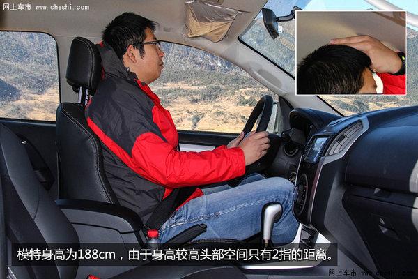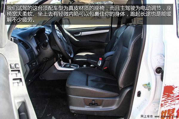 我们试驾的这台顶配车型为真皮材质的座椅,而且主驾驶为电动调节,座椅宽大柔软、坐上去有轻微内陷可以包裹住你的身体,跑起长途也是能缓解不少疲劳。而第二排座虽然没有前排那么柔软,但也都配备了三条三点式的安全带、三个头枕及中央扶手,并且支持靠背放倒和坐垫的折叠。这貌似在其他国产皮卡中都没有见到的实用配置。另外还有值得一提的就是我们试驾的这台车仅仅是跑了不到100km的新车,但坐在车内完全没有任何的异味和不舒服的感,值得点32个赞。