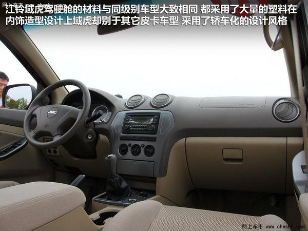 江铃域虎驾驶舱的材料与同级别车型大致相同,都采用了大量的塑料,但是刺鼻的味道却不是十分明显。在内饰造型设计上域虎却别于其它皮卡车型,采用了轿车化的设计风格,而且在装配工艺上也算不错,虽然谈不上精致,但却比很多竞争对手要细致不少,不会出现让你无法接受的缝隙。