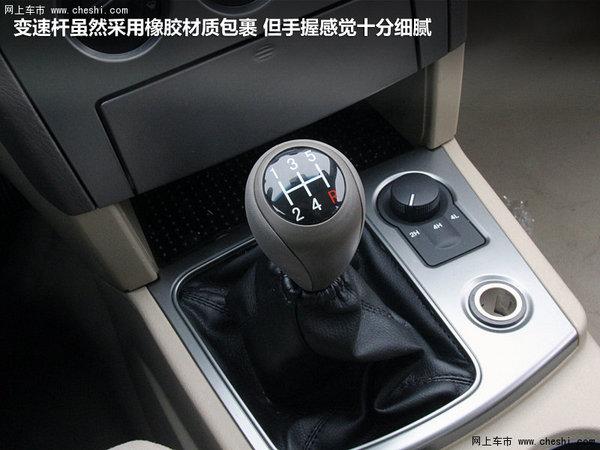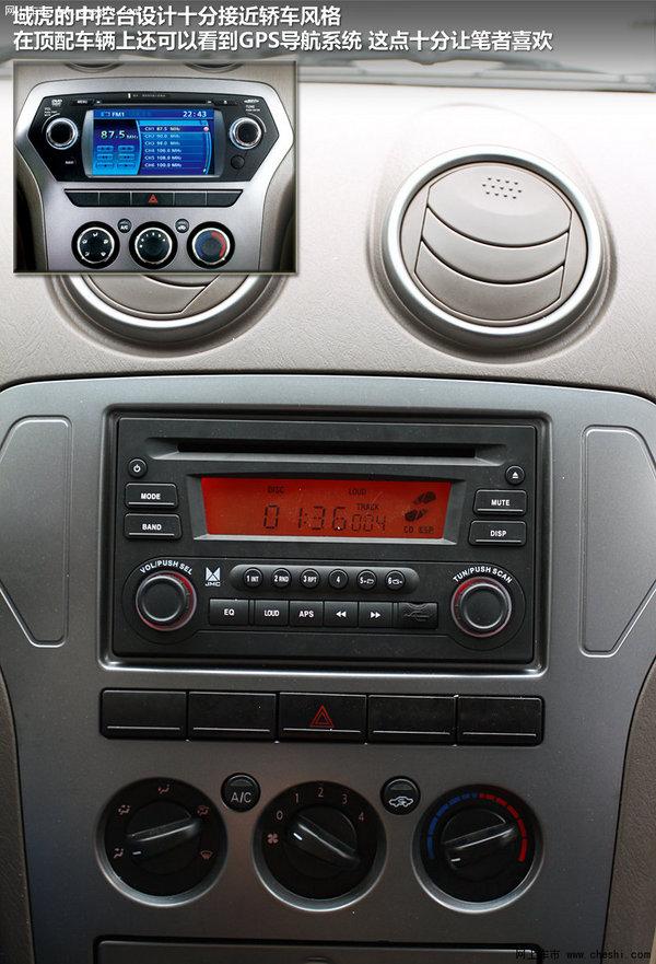 域虎的中控台设计十分接近轿车风格,在顶配车辆上还可以看到GPS导航系统,这点十分让笔者喜欢。域虎音响配备了多碟CD,比较遗憾的是缺少了标准USB接口,而是一个mini口,使用起来会略有不便。空调控制区域则分工明确,旋钮设计比较时尚,而且操作比较简单,非常容易上手。