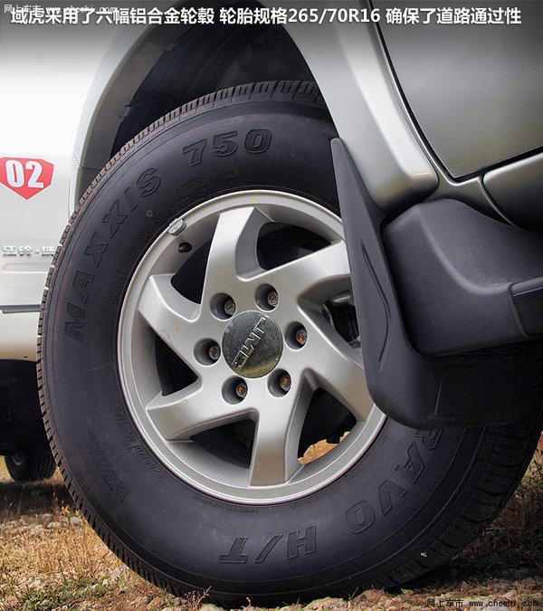 三角式整体货架的配备让域虎看起来充满了野性,同时也提高了货箱的使用性。域虎采用了四门式设计,大大满足了它的载客需求。与其身材相符,域虎配备了一对硕大的后视镜,最大程度上保证了驾驶员的视野。域虎采用了六幅全铝合金轮毂,轮胎规格为265/70R16。