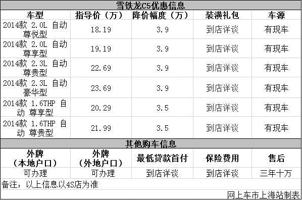日前网上车市上海站从上海智杰4s店了解到,目前该店雪铁龙C5优惠出售,详细请见下表: