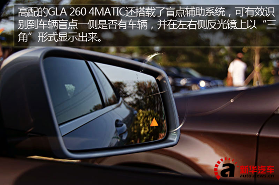 高配的GLA 260 4MATIC还搭载了盲点辅助系统,可有效识别到车辆盲点一侧是否有车辆,并在左右侧反光镜上以“三角”形式显示出来。当驾驶者忽略了盲点辅助指示标,仍打算向该侧变换车道时,车辆会发出听觉警告。此外,两款车型均可选装车道保持辅助系统,可识别出车辆意外驶出车道的情况,及时向驾驶员发出警告。